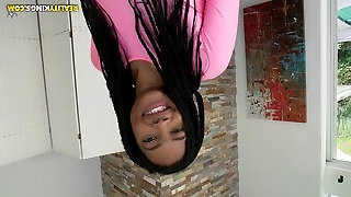 Flexible black girl with excellent bra-stuffers does a split on his dick