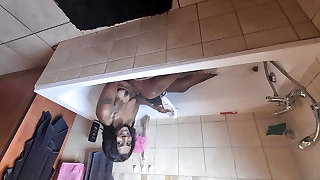 Ebony couple is having a hot fuck in the douche with a cumshot