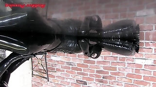 Full In Dark-hued Protection Catsuit And Mask Latex Sex High Heel And Pissing Face